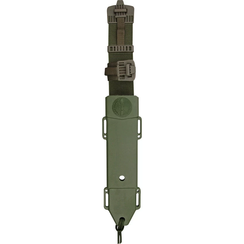 12 1/4″ overall. 7 1/4″ stainless bowie style blade with fileworked spine. Round palm-filling textured OD green polymer handle. Black powder coated cross guard and pommel. Lanyard hole. OD green hard nylon belt sheath with leg ties.