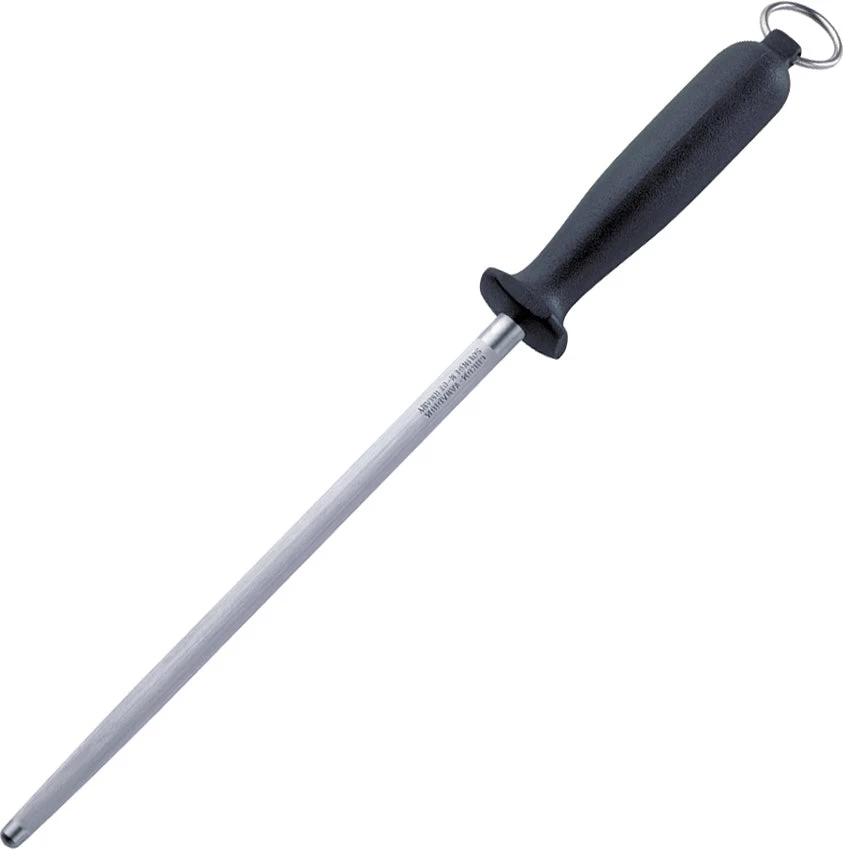 12″ overall. 7 3/4″ sharpening rod. Molded black POM handle with hanging ring. Bulk packed. Made in Argentina.
