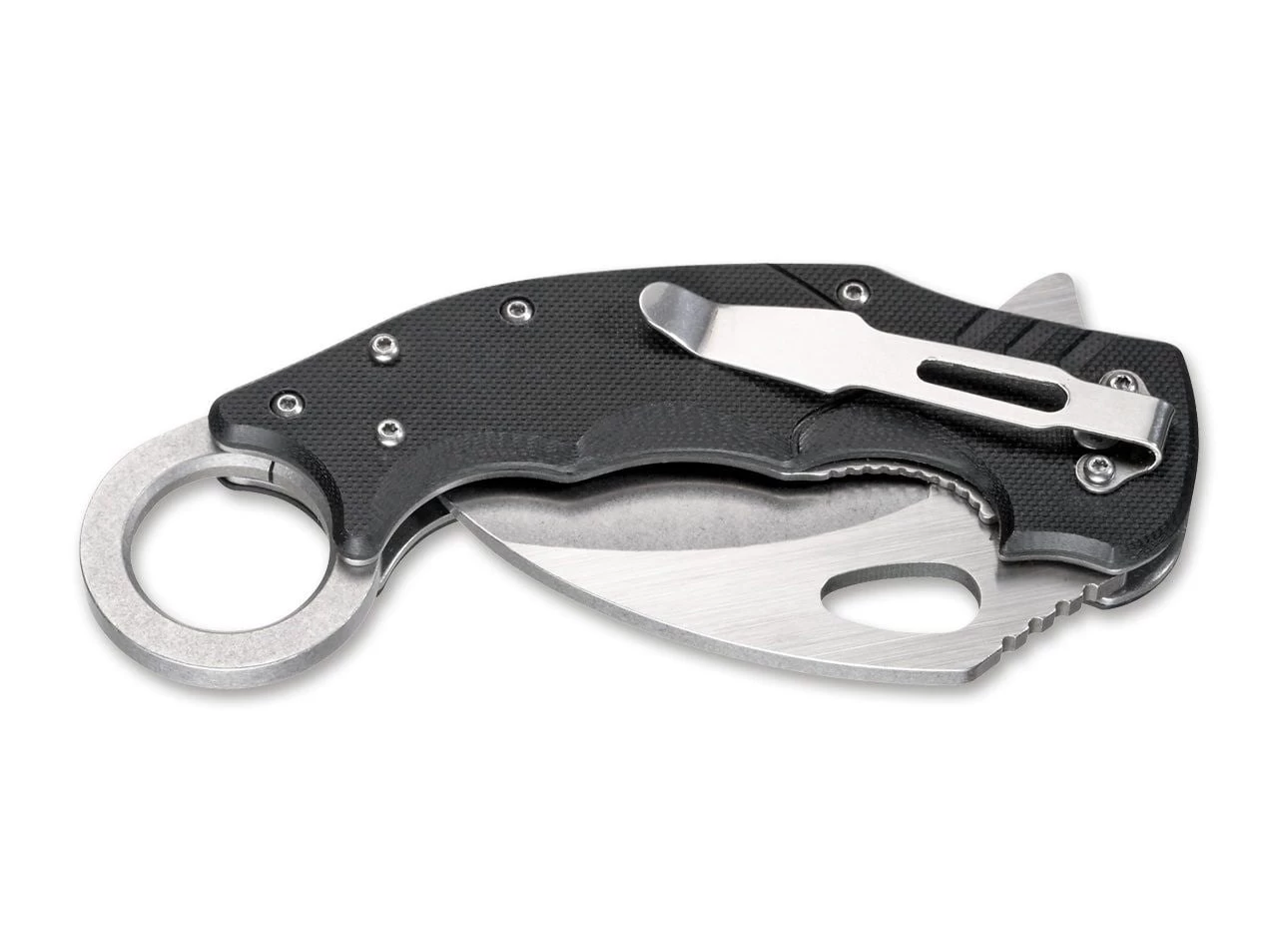 5″ closed. 2.63″ stonewash finish 440A stainless karambit blade. Black G10 handle. Extended tang. Thumb pull. Finger ring. Pocket clip. Boxed.
