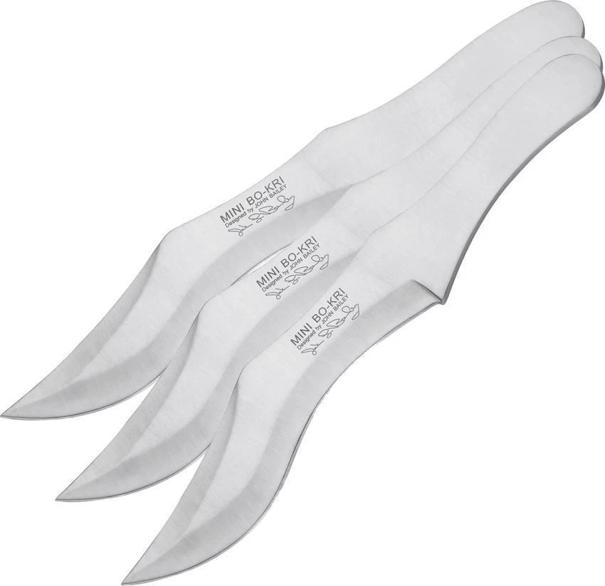 Includes three Mini BO-KRI throwing knives. One-piece 420J2 stainless construction. 10 3/4″ overall with 6 5/8″ blade. Brown leather belt sheath holds all three knives. Designed by John Bailey.