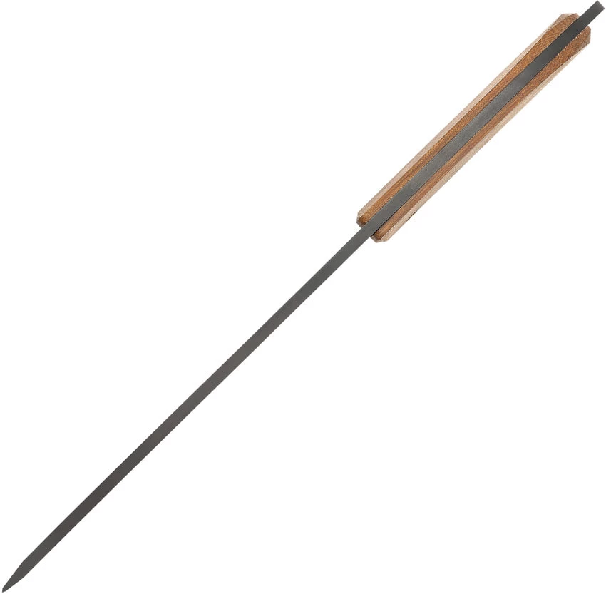 12.88” overall. 7.63” Dark Caswell finish 1095 carbon steel skinner blade. Smooth natural micarta handle. Brass pins. Lanyard Hole. Genuine brown leather belt sheath. Designed by Laramy Miller. Boxed.