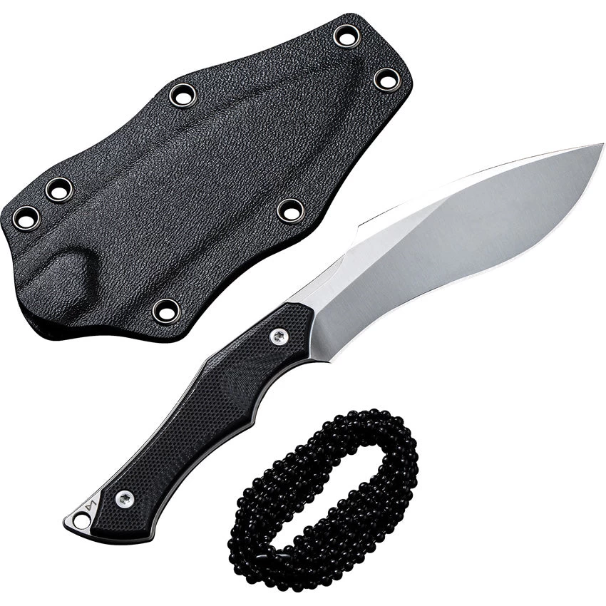 6.23” overall. 3.2” Satin finish Nitro-V steel kukri blade. Flat Grind. Black G10 handle. Lanyard Hole. Black kydex neck sheath with ball chain. Designed by Nate Matlack. Boxed.