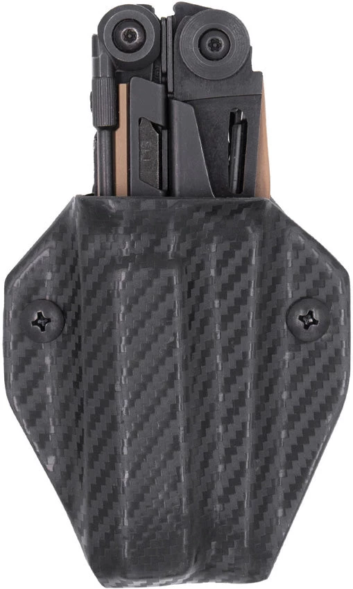 Compatible with Leatherman MUT. Pocket clip fits belts up to 1.75″. Adjustable retention. Black carbon fiber pattern Kydex construction. Tool pictured not included. Hang packaged.