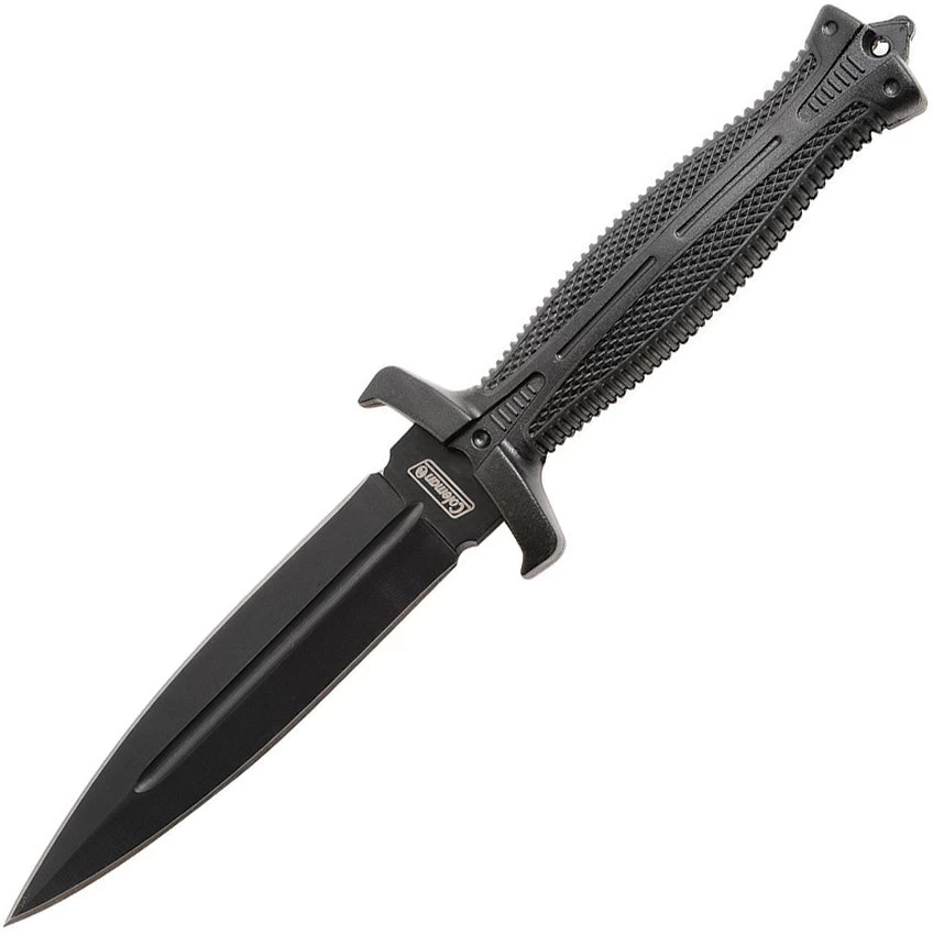 9.25″ overall. 4.75″ black finish double edge stainless dagger blade. Black textured rubber handle. Glass breaker. Lanyard hole. Sheath includes fire steel. Black molded plastic neck sheath. Boxed.