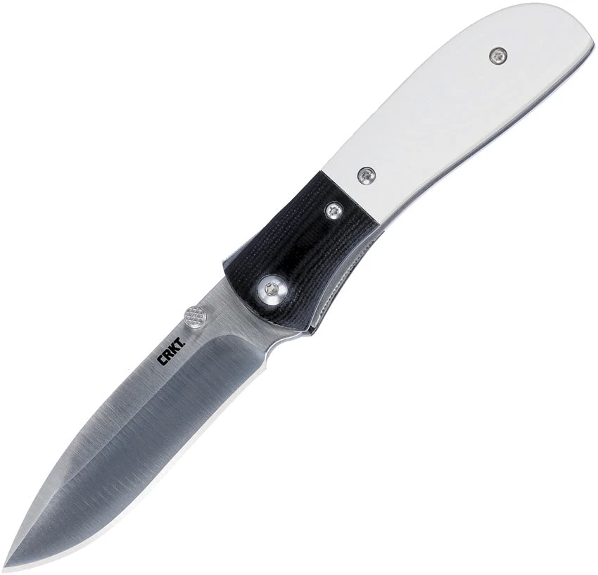 3.75″ (9.53cm) closed. 3.25″ (8.26cm) satin finish 8Cr13MoV stainless blade. G10 bolster(s). Thumb stud. Pocket clip. White resin infused fiber handle. Designed by Kit Carson. Boxed.