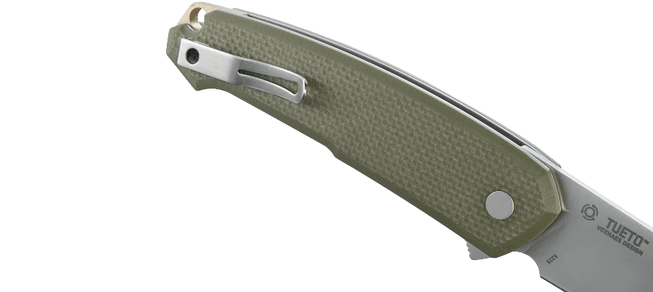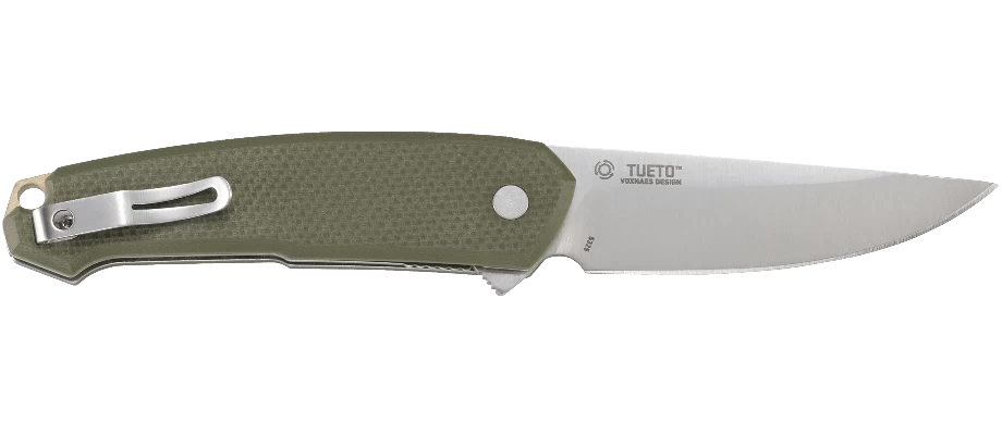 Assisted opening. 4.5″ (11.43cm) closed. 3.25″ (8.26cm) satin finish 1.4116 stainless blade. OD green G10 handle. Lanyard hole. Extended tang. Pocket clip. Designed by Jesper Voxnaes. Boxed.