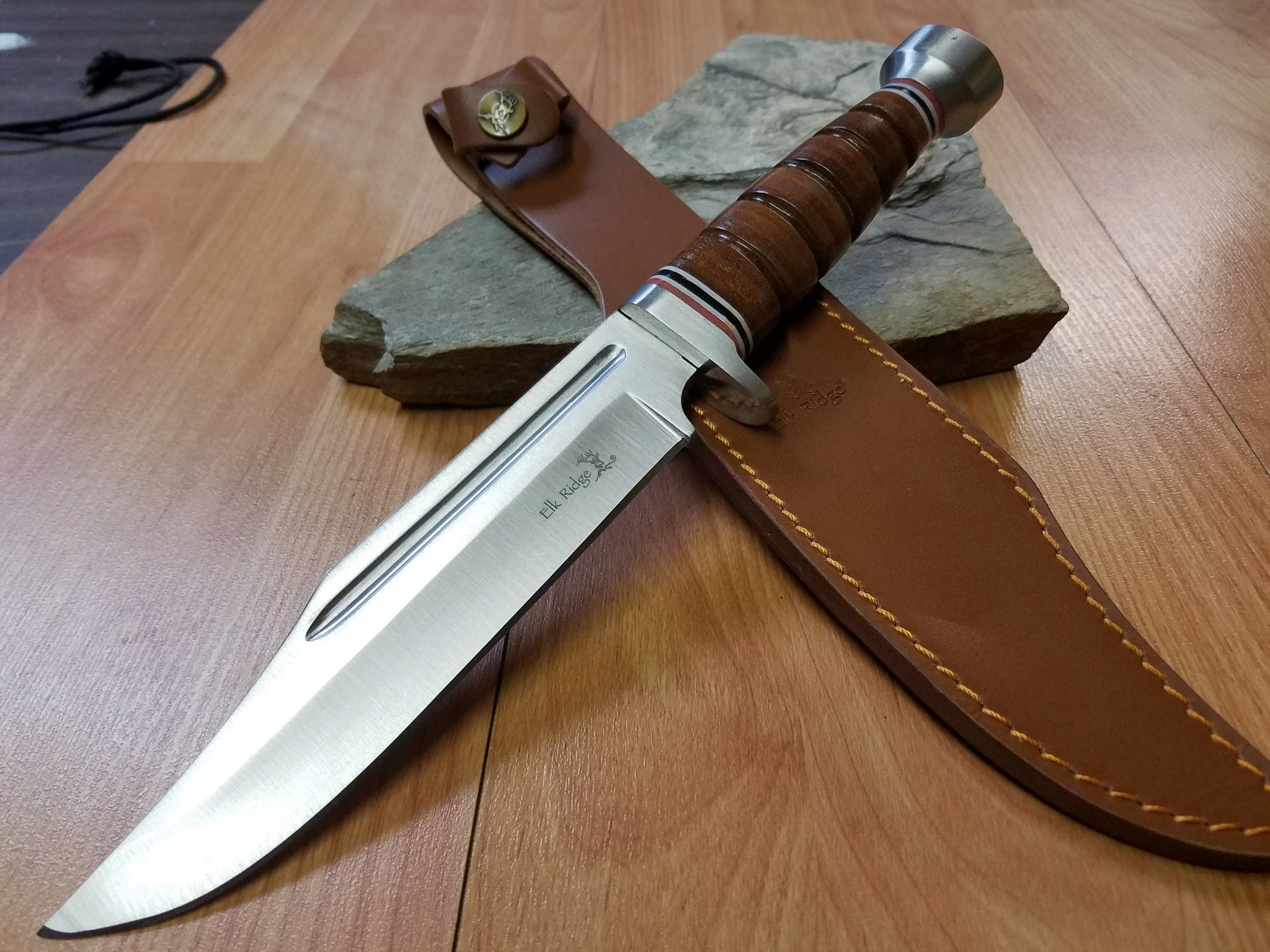 Elk Ridge Hunter. 11 3/4″ overall. 6 3/4″ 440 stainless blade with blood groove. Leather handle with brushed stainless finger guard and pommel. Leather belt sheath. Â Comes boxed.