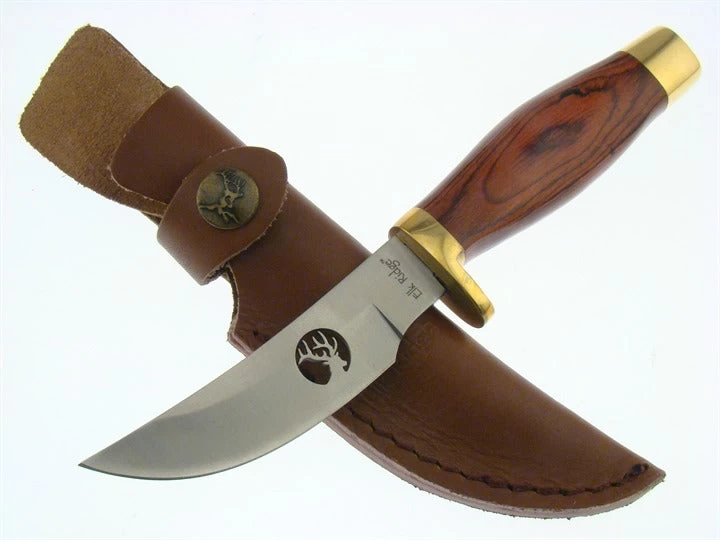 7 1/2″ overall. 3 5/8″ mirror polished stainless upswept blade with laser cutout of elk. Reddish brown rich grain wood handles with brass finger guard and pommel. Brown leather belt sheath. Â Comes boxed.