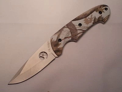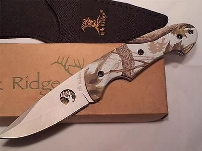 Elk Ridge Camo Hunter. 8 5/8″ overall. 4″ matte finish 440 stainless blade with elk head laser cutout. Full tang. Snow blind camo finish aluminum handles with lanyard hole. Black nylon belt sheath. Comes boxed.