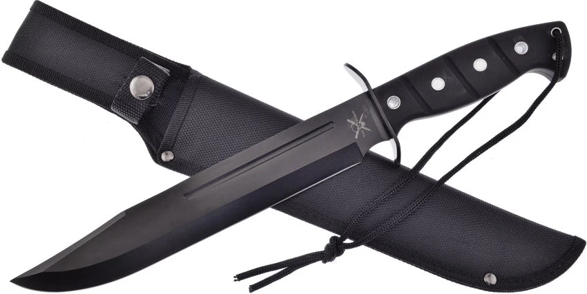 Tac Xtreme. 15″ (38.1cm) overall. 10″ (25.4cm) black finish stainless clip point blade. Black rubber handle. Stainless guard. Lanyard hole. Full tang. Black nylon belt sheath. Boxed.