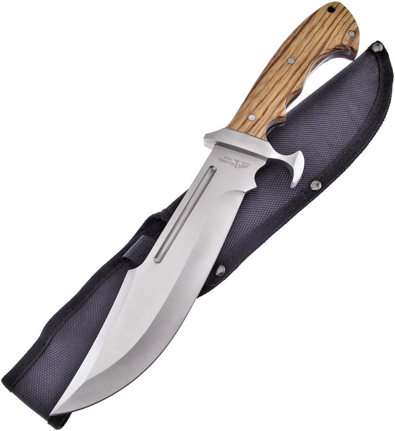 Black Hills Steel. 13.5″ overall. 8″ satin finish stainless clip point blade. Zebrawoodhandle. Stainless guard. Full tang. Lanyard hole. Black nylon belt sheath. Boxed.