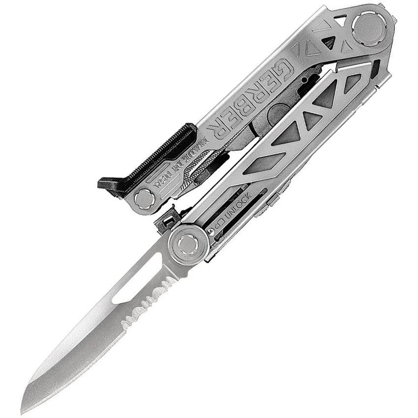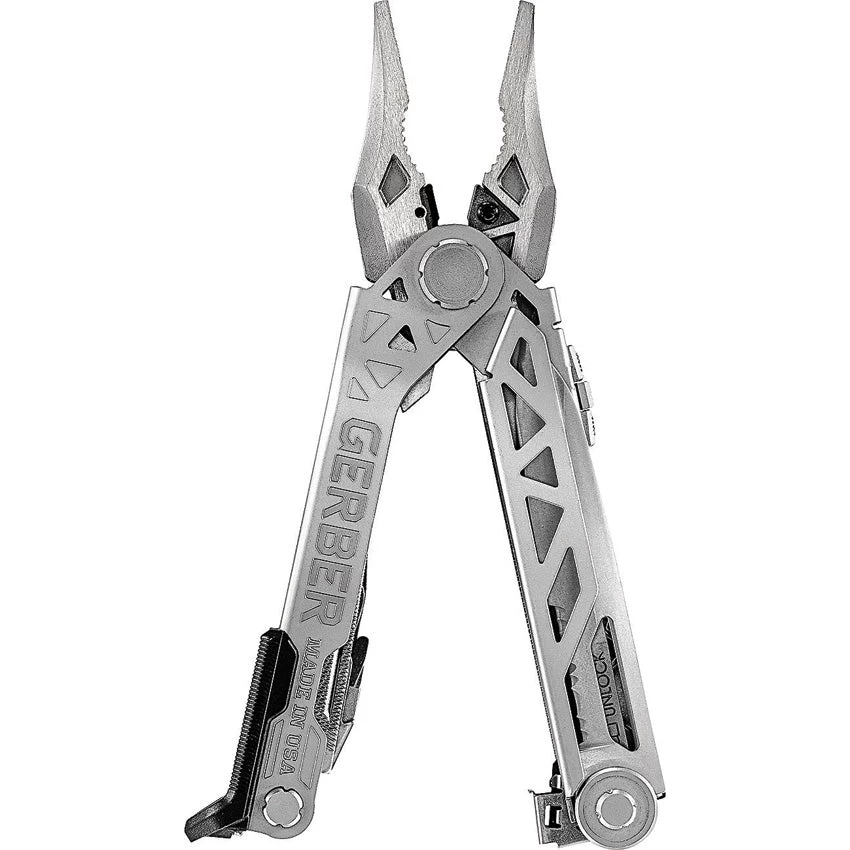 4.75″ closed. 6.63″ overall. Tools include: Needlenose pliers l Wire stripper l Wire cutter l Serrated blade l Pry bar l Bottle opener l Awl l File l Scissors. One thumb opening system. X-Channel rail system. Magnetic 3.2″ center-axis bit driver. Magnetic flathead and Phillips bits. All tools are tumbled finish. Brown leather belt sheath. Boxed.