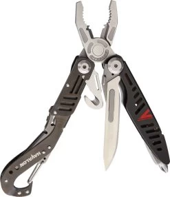 Hydra Linerlock. 4.5″ closed. Black stainless handles. Tools include: Carabiner l Hex/Bit driver l Pliers l Small blade l Wire cutter l Wire stripper. Includes six #60A blades and two Piranta saw blades. Storage for two additional bits. Jim Shockey case. Black nylon zippered storage case. Boxed.