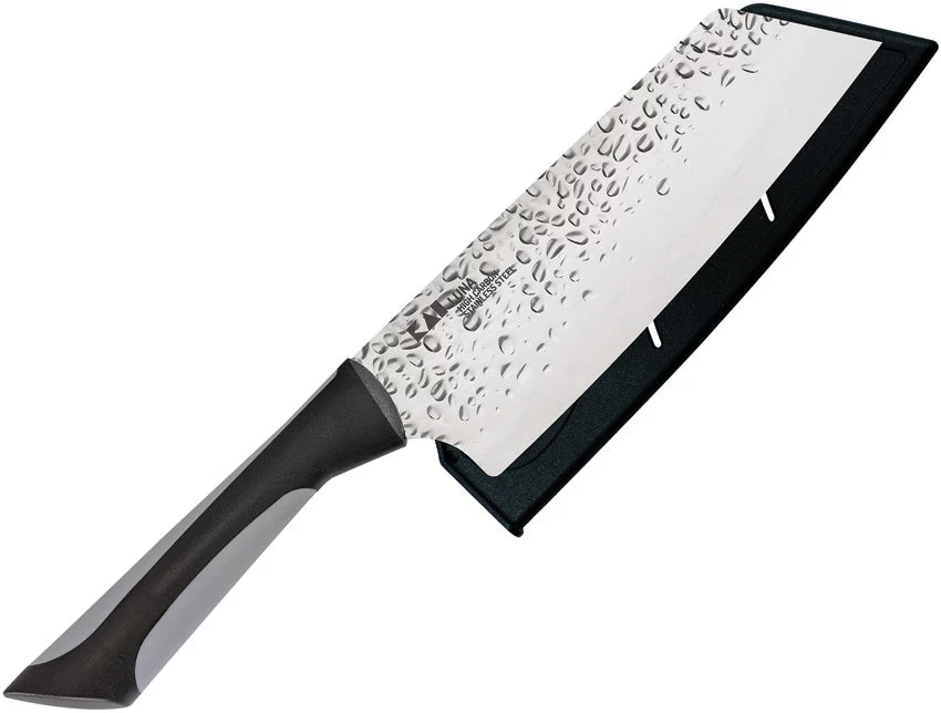 Luna Asian Utility. 12″ (30.48cm) overall. 6.25″ (15.88cm) hammered finish high carbon stainless blade. Black and gray rubberized synthetic handle. Hand washing and drying are recommended. Do not cut frozen food with these knives. Do not use scouring pads, steel, or gritty cleaners. Hang packaged.