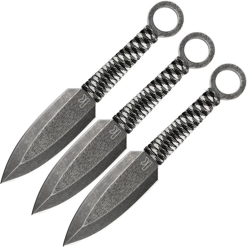 Includes three 9″ overall throwing knives with 4 1/2″ black-oxide BlackWash finish 2Cr13 stainless double-edged spear point blade. Full tang. Black and white paracord wrapped handle with oversized ring pommel. Black nylon belt sheath holds all three. Hang packaged.