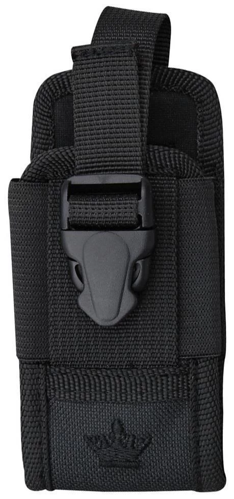 Black ballistic nylon construction with elastic sides which expand to fit wide and different size items such as multi-tools, flashlights, sharpeners, phones, ammo, grenades, etc. Fits items up to 4 3/4″ closed/overall. Top of pouch is closed with adjustable nylon strap. Can be installed on top of any Kizlyar Supreme sheath with MOLLE system or any other MOLLE-compatible products such as webbing bags. It can also easily be installed on belts of different widths. The height of attachment can be regulated by putting the belt through various MOLLE straps.