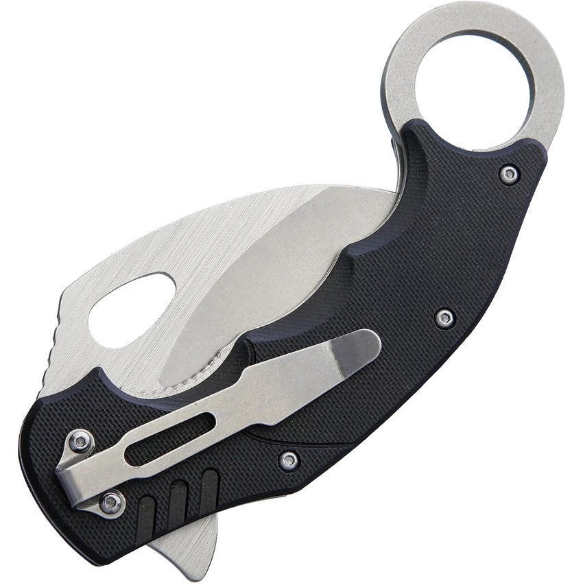 5.25″ closed. 2.63″ stainless karambit blade. Black finger grooved G10 handle. Finger ring. Extended tang. Thumb pull. Pocket clip. Stonewash and satin finish blade. Boxed.