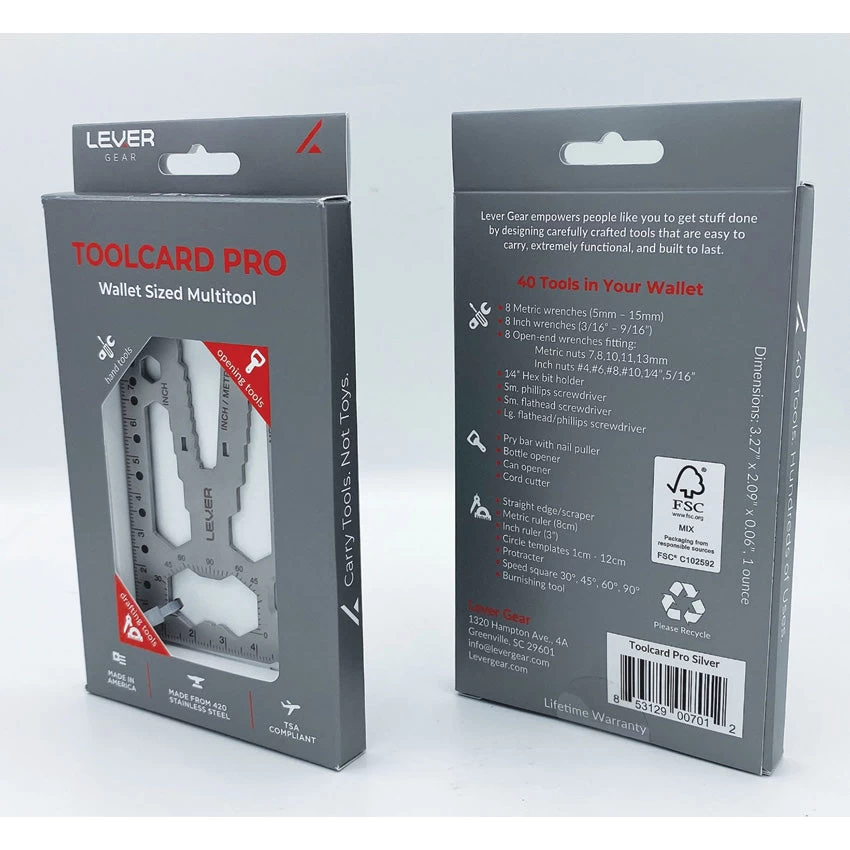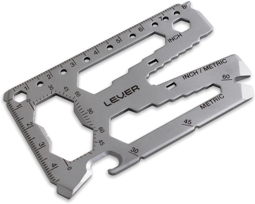 Dimensions: 3.27″ x 2.09″ x 0.06″. Includes: 8 metric wrenches (5mm-15mm); 8 inch wrenches (3/16″-9/16″); 8 open-end wrenches (metric-7;8;10;11;13mm; inch-#4;#6;#8;#10;1/4″;5/16″); 1/4″ Hex bit holder; Small Phillips screwdriver; Small flathead screwdriver; Large flathead/Phillips screwdriver; Pry bar with nail puller; Bottle opener; Can opener; Cord cutter; Straight edge/scraper; Metric ruler (8cm); Inch ruler (3″); Circle template (1cm to 12cm); Protractor; Speed square (30; 45; 60; 90 degrees); Burnishing tool. Weight: 1oz. 420 stainless construction. Boxed with hanging tab.