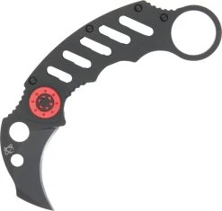 4 5/8″ closed framelock. 420HC stainless talon blade with thumb hole pull. 420 J2 stainless frame with finger ring. Both blade and frame have a non-glare black finish. Frame has red trim and stainless pocket clip.