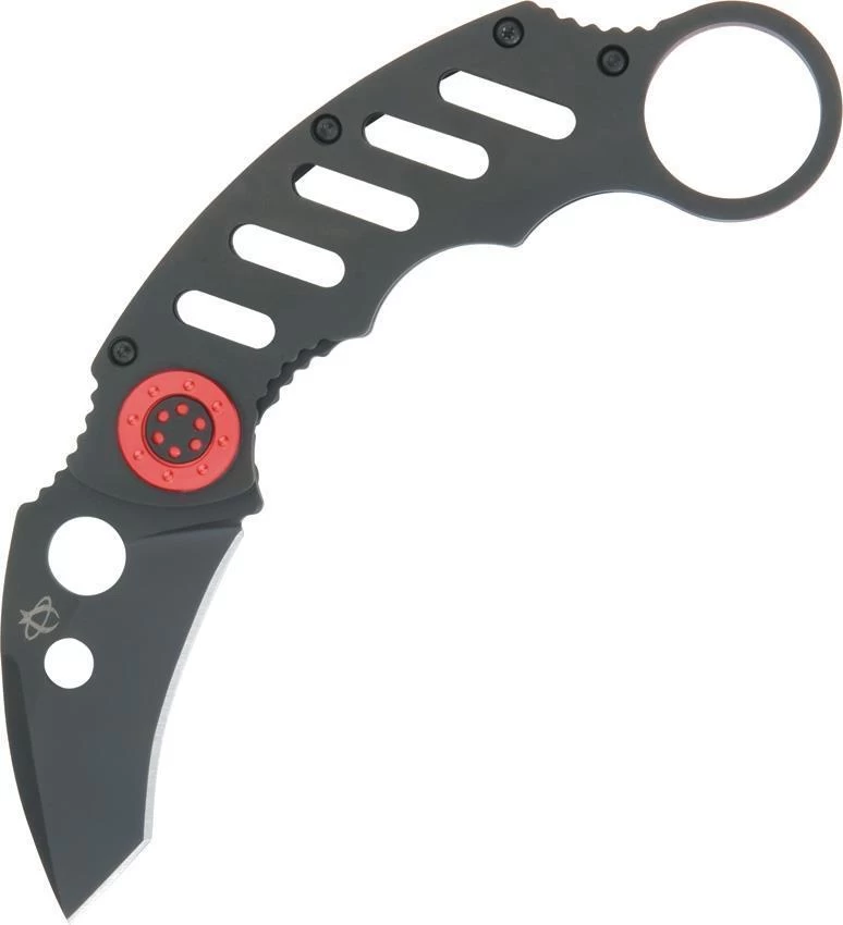 4 5/8″ closed framelock. 420HC stainless modified tanto blade with thumb hole pull. 420 J2 stainless frame with finger ring. Both blade and frame have a non-glare black finish. Frame has red trim and stainless pocket clip.