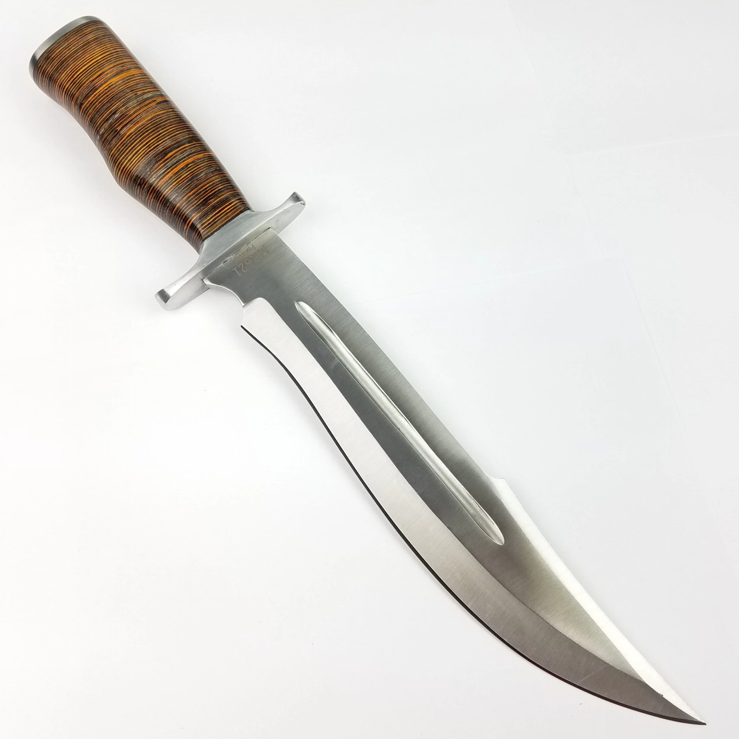 15″ (38.1cm) overall. 10″ (25.4cm) satin finish stainless bowie blade. Stacked leather handle. Stainless guard. Brown leather belt sheath. Boxed.