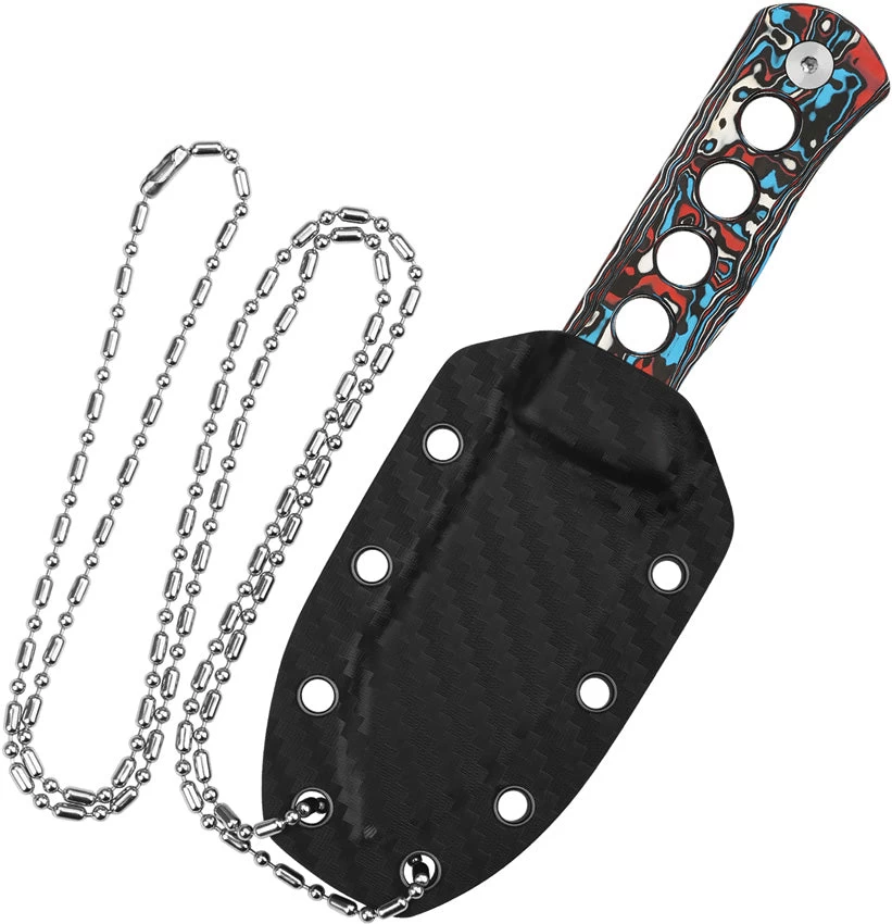 5.25” overall. 2.50” Laminated damascus steel drop point blade. Flat Grind. Nebula black, blue, red, and white carbon fiber handle. Comes with a black kydex sheath and ball chain. Boxed.