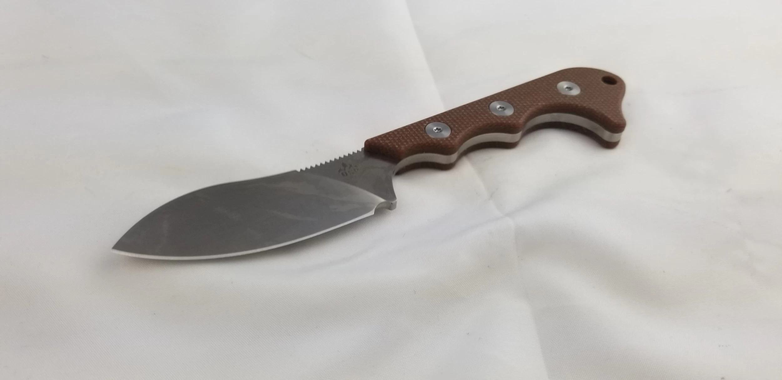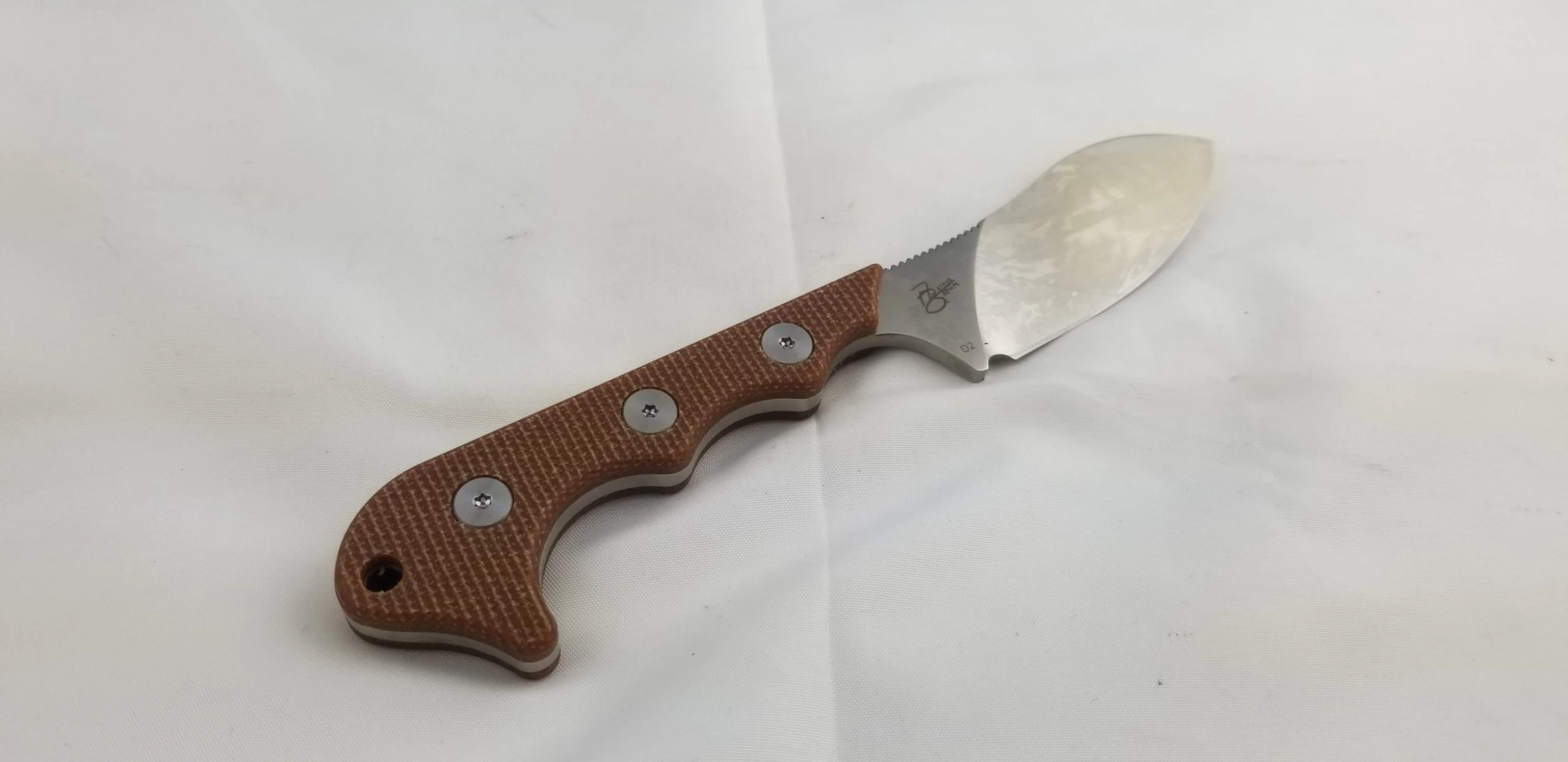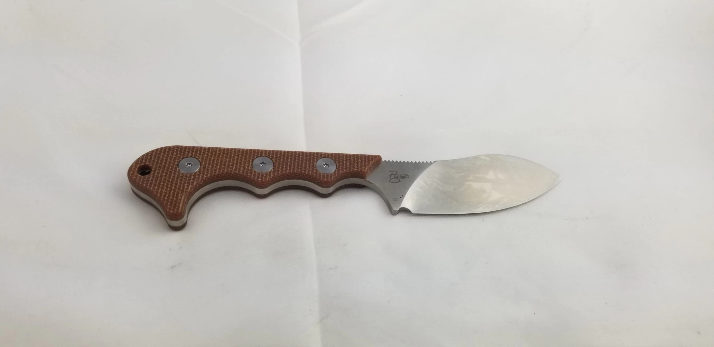 6.5″ (16.51cm) overall. 2.88″ (7.32cm) satin finish D2 tool steel blade. Brown linen micarta handle. Full tang. Lanyard hole. Ball chain lanyard. Designed by Arthur Brehm. Black Kydex neck sheath. Boxed.