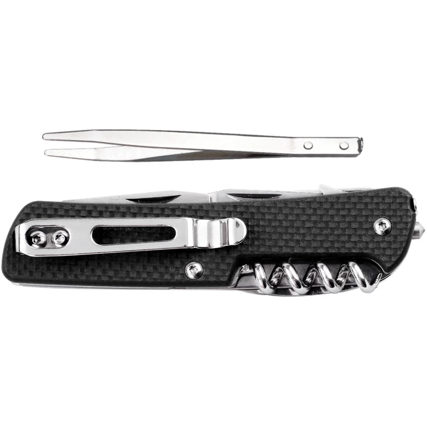 3.75″ (9.53cm) closed. 12C27 Sandvik stainless blade. Black G10 handle. Tools include: Large blade l Glass breaker l Pocket clip l Tweezers l Corkscrew l Bottle opener l Large screwdriver l Wire stripper l Belt/cord cutter l Small screwdriver l Keyring l Saw blade l Reamer with sewing eye l Scissors I Drill I Facer. Boxed.