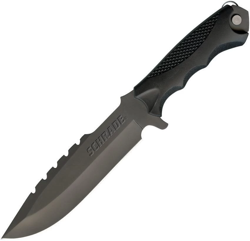 11 1/2″ overall. 6 1/2″ gray titanium finish 8Cr13MoV stainless blade with notched spine. Finger grooved black rubber handles. Stored inside handle is a multi-tool with: flat head screwdriver, bottle opener, 1/4″ hex wrench, and wrench driver. Pull-ring slides to release the multi-tool. Molded black glass filled nylon sheath.