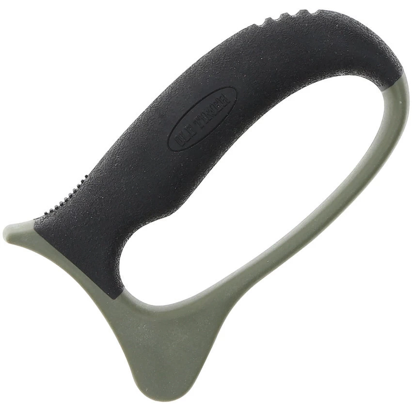 Black and green rubber handle. Includes: Boning knife with 6″ blade; Guthook with 5″ blade; Caping with 4″ blade; knife sharpener; (3) Pair latex gloves. Black synthetic zippered storage case. Boxed.