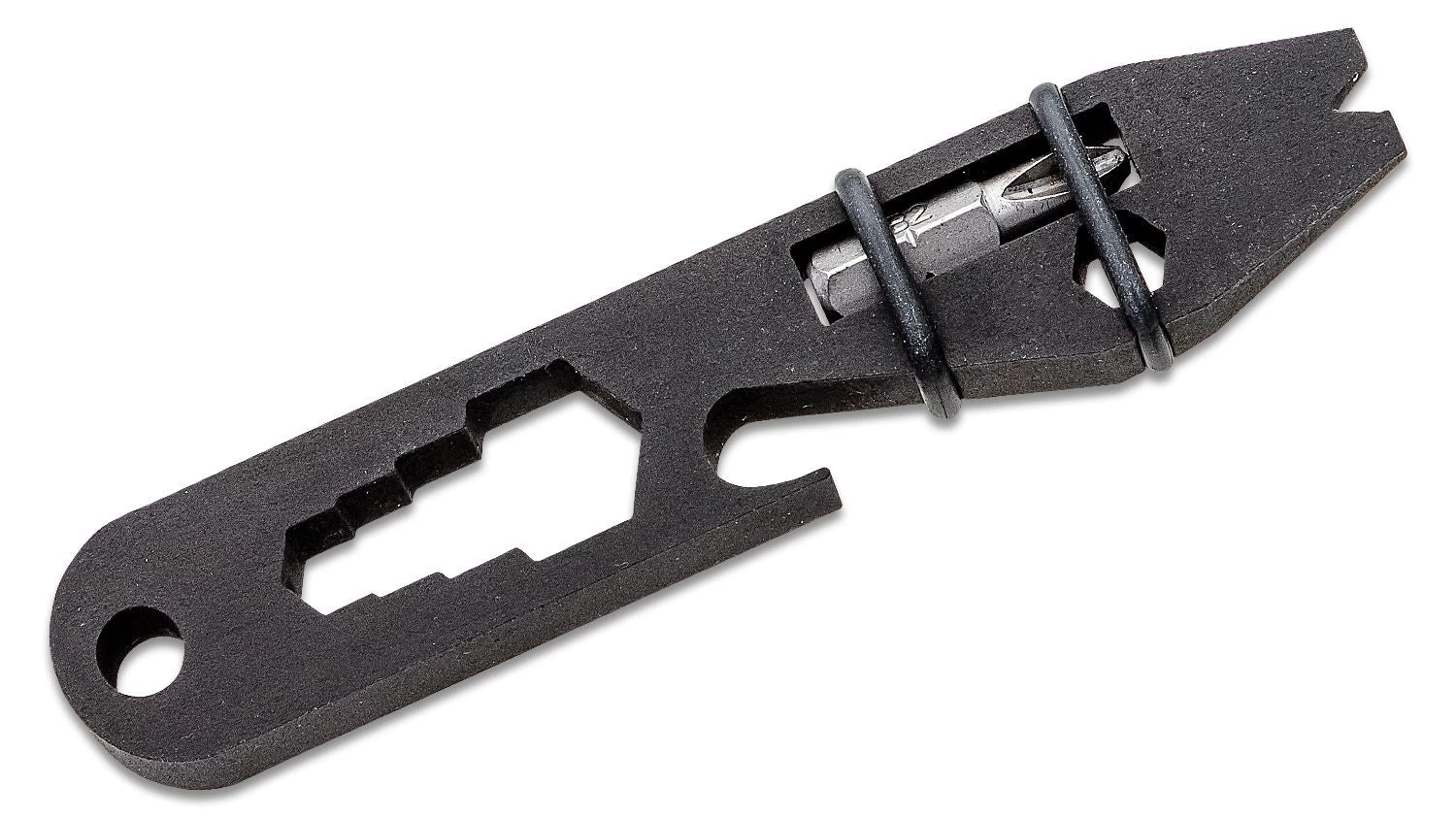 4.10″ overall. 1075 carbon steel. This multi-tool includes a pry bar feature, bottle opener, four different wrench fittings, along with a detachable Phillips screwdriver bit. Weighing in at under two ounces and just over four inches in length, this sleek tool won’t weigh down your everyday carry keychain or get in the way. Made in USA.