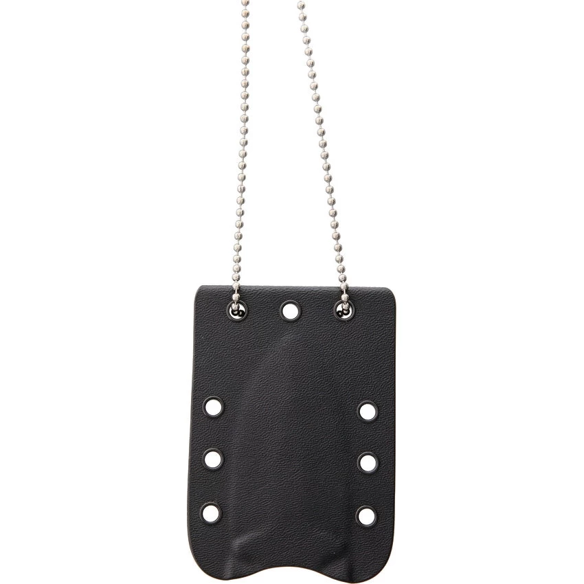 Overall: 6.5″; Blade: 3″ l 1095 high Carbon Steel. l Standard Edge l Tumbled Finish; Handle: Carbon Steel; Other Info: Full Tang. Double edged wide spear point blade. Hardened to 56-58 HRC. One piece construction. Contoured skeletonized handle with dual lashing holes. Black molded Kydex neck sheath with beaded ballchain. Designed by Leo Espinoza. Bulk Packed. Made in USA.