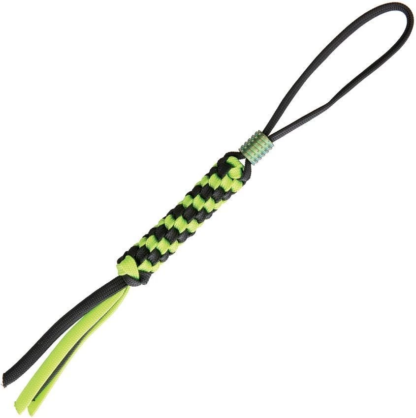 Black and green braided paracord construction with green anodized titanium bead. Bulk packed.
