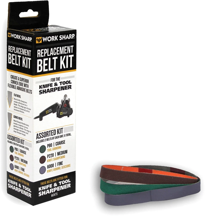 Other Info: Six total. Two belts of each grit( P80-coarse, P-220-Medium, and 6000-Fine) Belts are fitted for Work Sharp Knife and Tool Sharpener (WSKTS). Hang Packaged.
