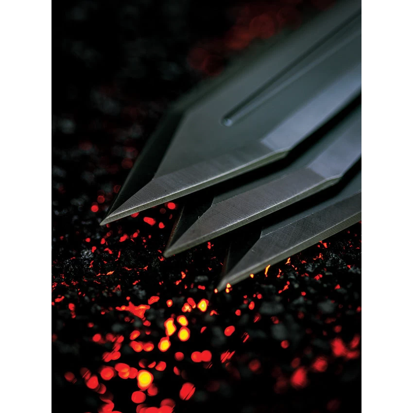 14.6″ (37.08cm) overall. 8.1″ (20.57cm) black stonewash finish 3Cr13 stainless blade. One-piece construction. Lanyard hole. Weight: 1.3lb. Set of three. Blade guards are formulated to protect throwers from bounces and knives flying through protective fencing while still allowing for the highest precision. Extended dual bladed knife allows for full coverage over a full inch down the blade. Boxed.